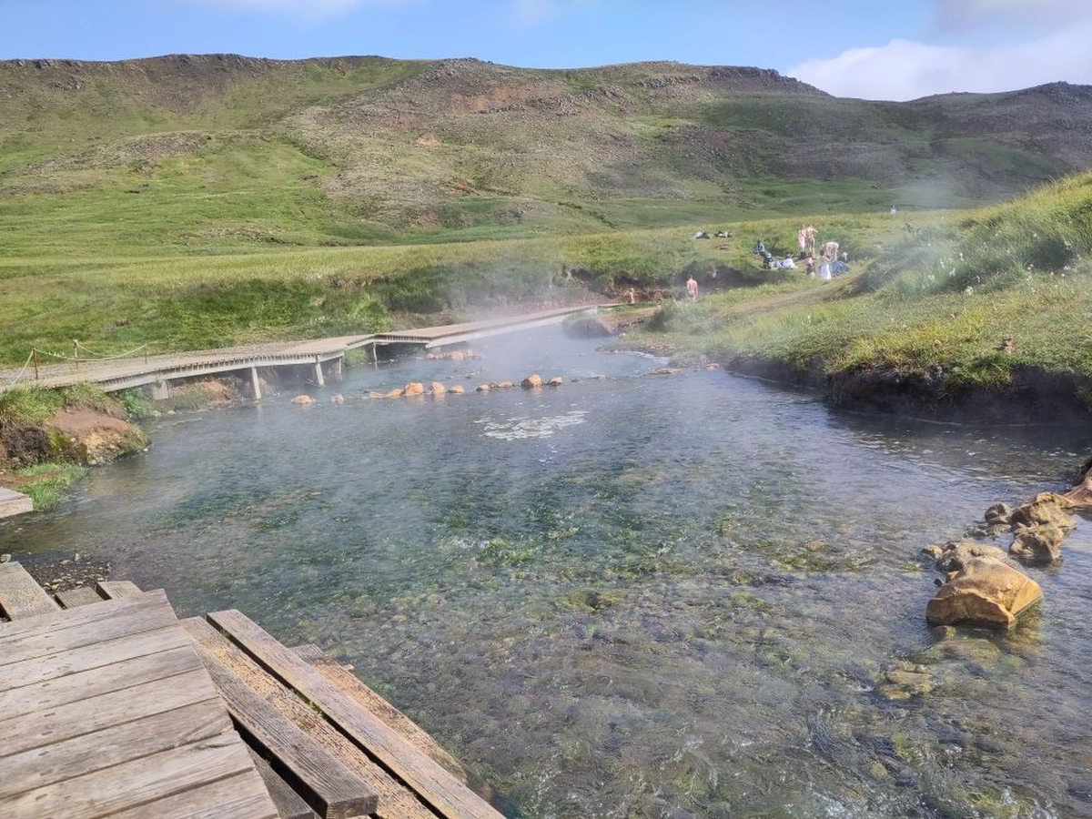 Top motiviert kamen wir dann zum Bachlauf des Reykjadalsá wo schon viele im warmen Wasser hockten. Schlau wie wir sind, gingen wir bis zum Ende ganz oben durch, weil – do is jo niemand! - … Jou – je weiter oben am Bachlauf, desto heißer das Wasser! Dort oben hätten wir Würschtel kochen können und sie hätten einen Reißverschluss bekommen… 🌭