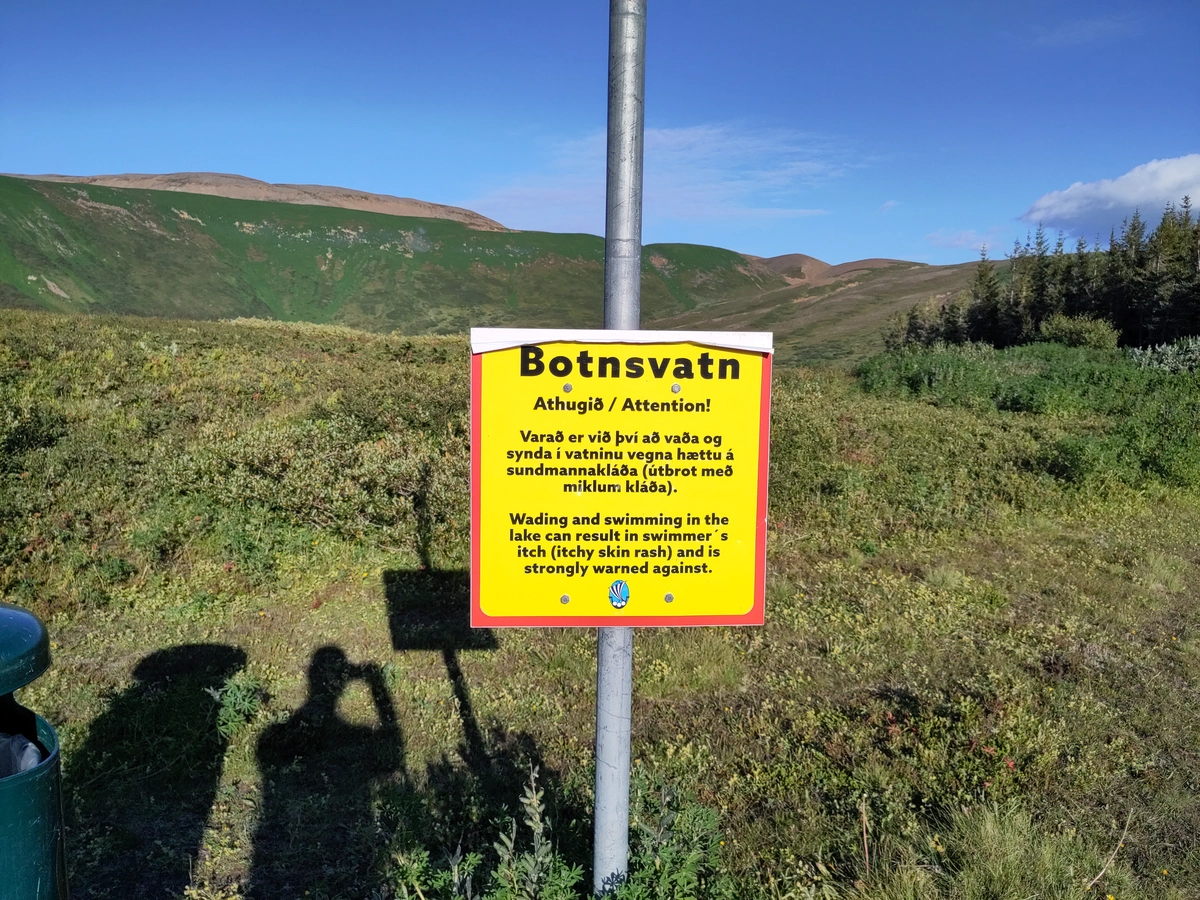 Am hinteren Ende des Sees haben wir ein wichtiges Schild entdeckt! Dort wurden Wurmlarven beschrieben, die Badedermatitis auslösen: