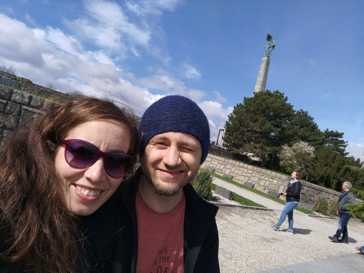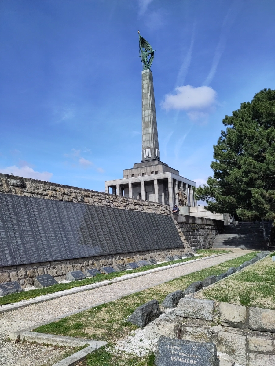 Oben angekommen merken wir - Öha! des is goa nit so kloa des Mannschgerl - eigentlich is es a riesiges Trum sowjetischer Soldat der ein Hakenkreuz zertrampelt und auf einem Obelisk bzw. auf einem riesigen Friedhof/Massengrab/Kriegerdenkmal steht. In anderen Worten: Das Kriegerdenkmal bzw. der Friedhof Slavín wurde zu Ehren der im Zweiten Weltkrieg gefallenen sowjetischen Soldaten erbaut und zum 15. Jahrestag der Befreiung der Stadt (3. April 1960) der Öffentlichkeit übergeben.