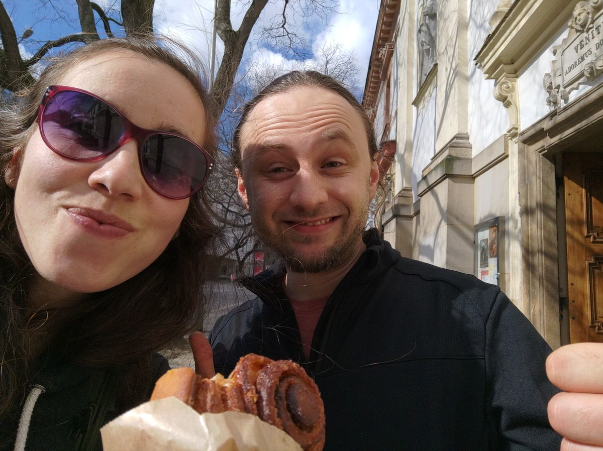 Karin staunte dann nicht schlecht, als Steff, der si sonst eigentlich so goar ned drum reißt irgendwo zu bestellen, plötzlich das Wort ergreift und zwei Weckerl und a Zimtschleife bestellt! - Wohlgemerkt eine etwas sinnlose Mischung aus Satzfetzen in Slowakisch 🇸🇰 - ähm - Tschechisch 🇨🇿 - ähm - Polnisch 🇵🇱! Und es hat sogar funktioniert! Karin war echt begeistert, als er dann auch noch eine „kleine Reklamation” gemanaged hat. Die Verkäuferin hat nämlich vergessen die Zimtschnecke einzupacken…