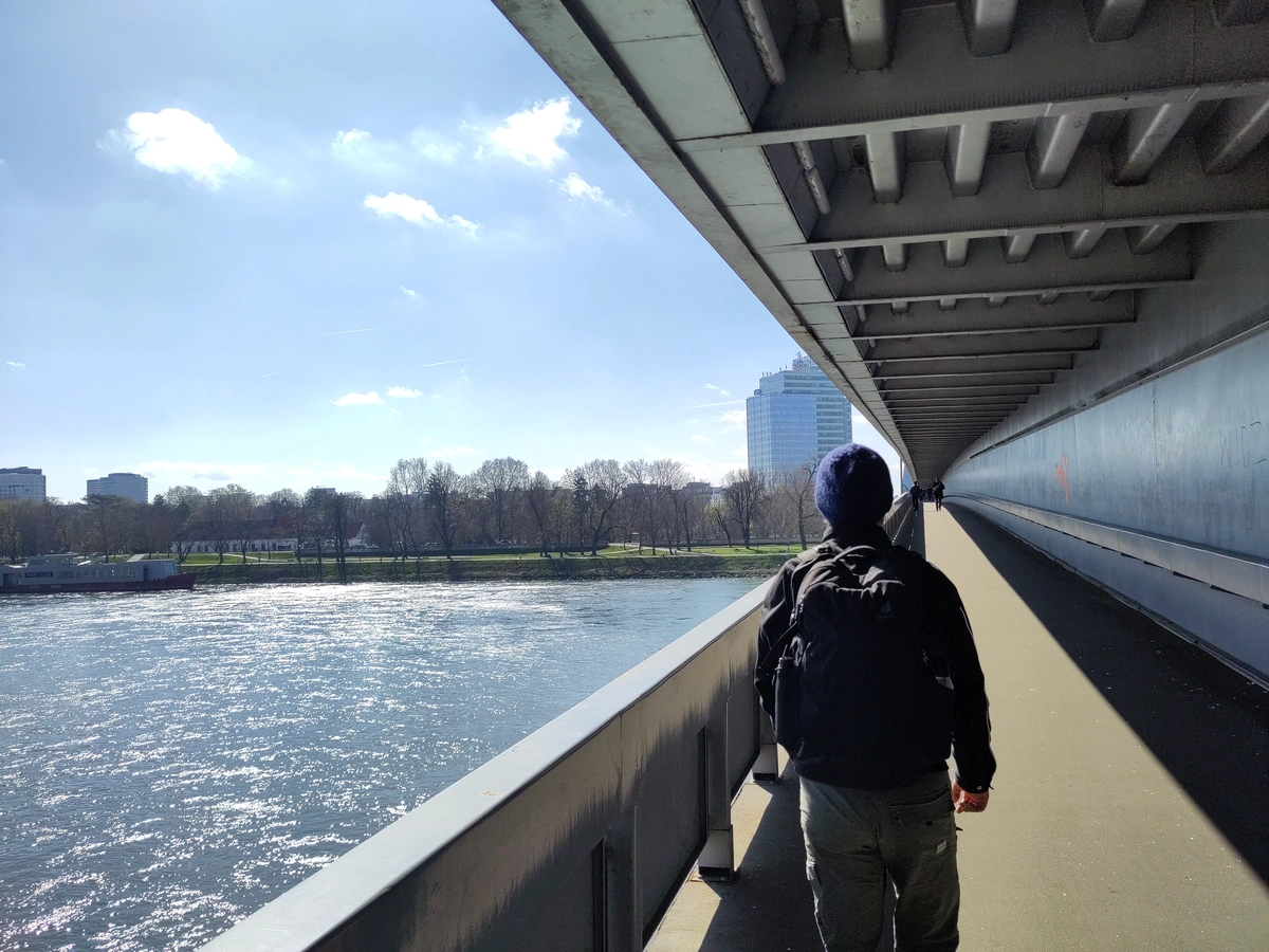 Erstmal ausschlafen und Kaffee-trinken! Danach packen wir unsere 7 Zwetschken (mit „k”!) zam und erkunden das Gebiet südlich der Donau. Das heißt wir spazieren einmal über die Seilbrücke - puhhhh de hat ganz schön gewackelt, aber ziemlich cool dass es eine eigene Ebene für Fußgänger gibt! 🚶