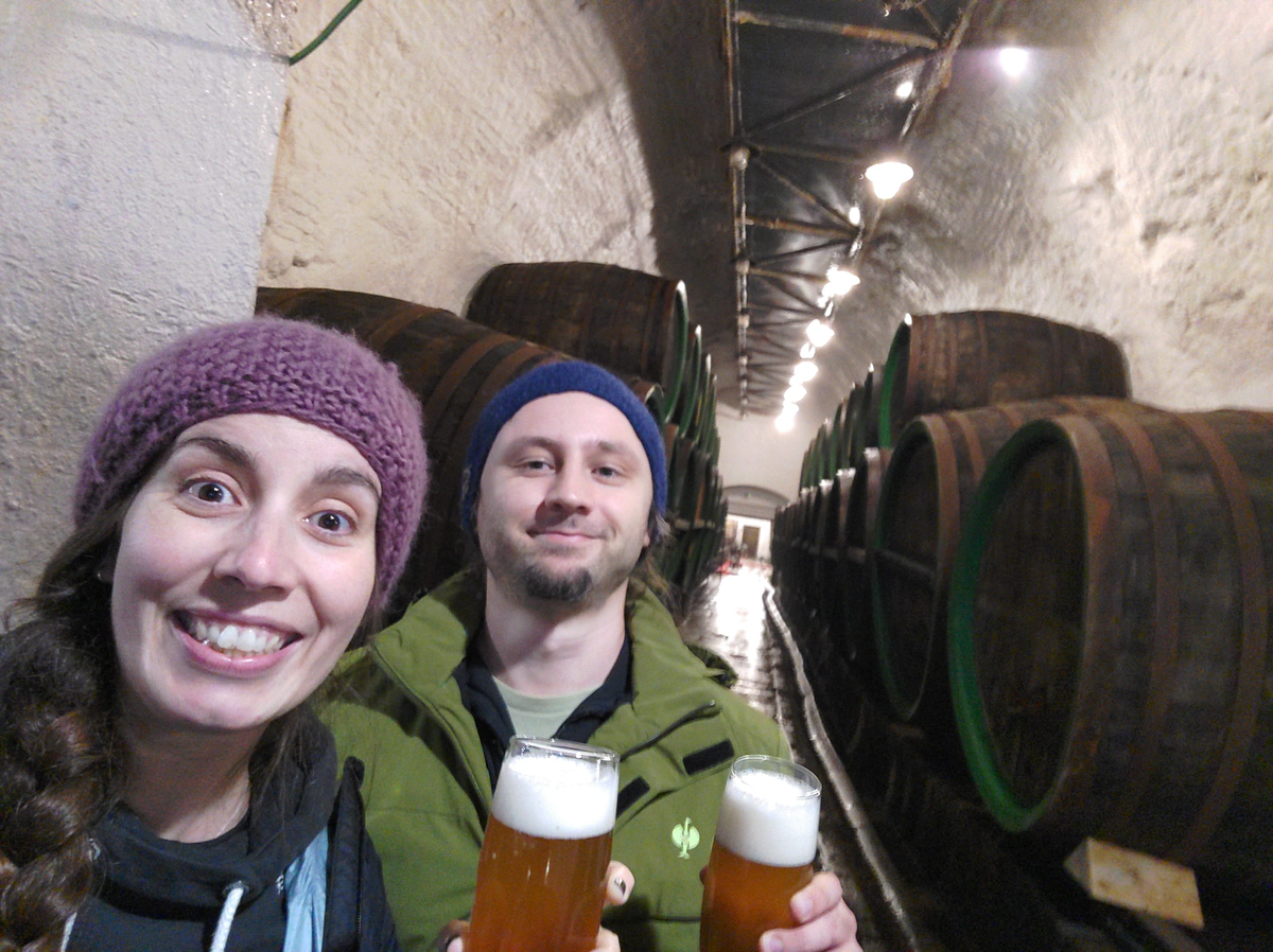 Zufälligerweise führt der Weg von Steffs Heimatort in die tschechische Hauptstadt Prag (🇨🇿: Praha) direkt vorbei an der Traditionsbrauerei Pilsner Urquell 🍺. Eh kloa, dass wir da ned einfach vorbei fahren, sondern unseren ersten Halt mit einer Tour durch die Brauerei verbinden. Weil wir aber noch a bissl Zeit haben bevor die Führung losgeht, spazieren wir noch eine kleine Runde durch Pilsen (🇨🇿: Plzeň), wo wir gleich mal einen fetten Weihnachtsmarkt entdecken. Eigentlich schaut das relativ ähnlich aus wie bei uns. Es gibt lokale Schmankerl wie bramboráky (🇩🇪: Kartoffelpuffer, BY: Reiberdatschi), koláč (🇦🇹: Golatschen, 🇩🇪: entspricht „Plundergebäck” (Karin findet den Ausdruck ziemlich öd)), und natürlich auch ungarischer 🇭🇺 Baumkuchen… Jaaa… wir wissen es: Das ist komisch! Aber an jeder Ecke findet man hier Baumkuchen, der ja eigentlich aus Ungarn kommt. Das hat auch unser Prag-Guide Brandon bestätigt 🤔.